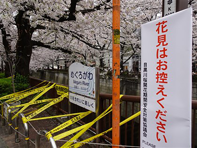 東京疫情復燃傾向明顯,多處賞櫻景點立告示牌,呼籲民眾要做好防疫工作。
