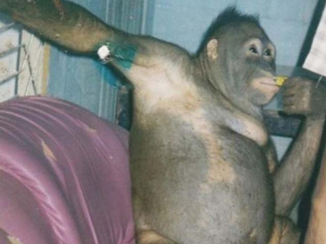 印尼紅毛猩猩「波妮」(Pony)(右圖)歷經悲慘遭遇,就是因為當地男性認定與猩猩性交較為刺激,把牠全身毛髮剃除、用鎖鏈栓住,還要戴耳環、化妝,淪為性奴供村民「享樂」。