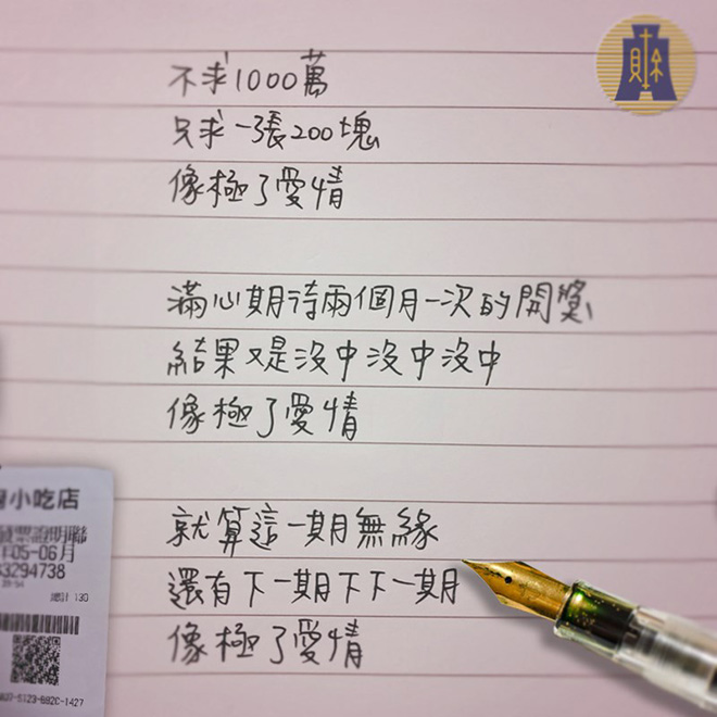 最新一期統一發票25日開獎,財政部臉書粉絲專頁今天搭上寫詩熱潮,寫到「不求1000萬,只有一張200塊,像極了愛情」,發表3首新詩創作,道出許多民眾「摃龜」的哀傷,引起共鳴,貼文超過百次分享。