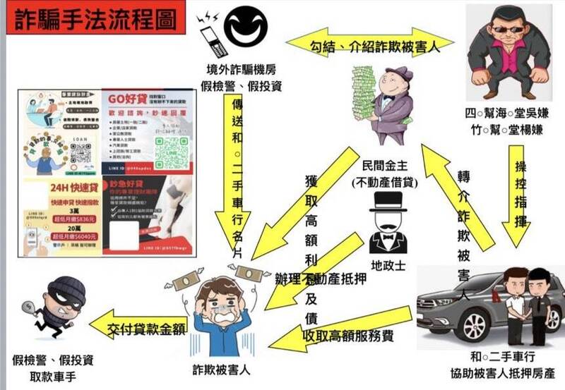 境外機房先以假檢警或假投資手法詐騙被害人,待被害人資金用罄再誘騙向該車行申貸,該車行表面經營二手車買賣,暗中從事融資及不動產抵押貸款,並創設「貸款通」、「快速貸」等LINE帳號,誆稱「沒有辦不下來的貸款」等口號招攬民眾。